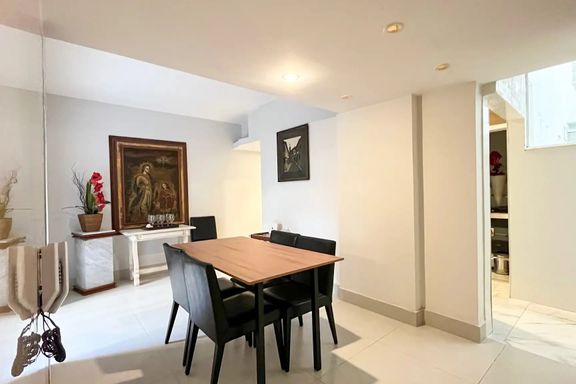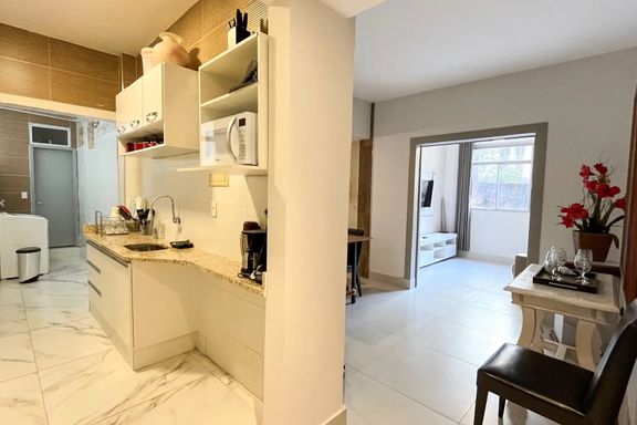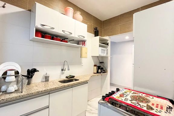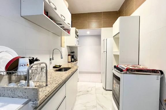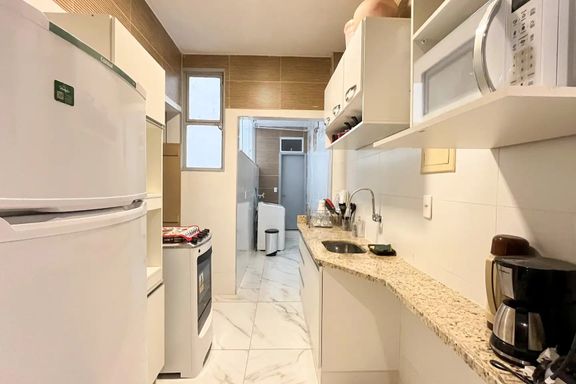 Cozinha funcional, equipada com armários planejados, bancada em mármore e piso em porcelanato.