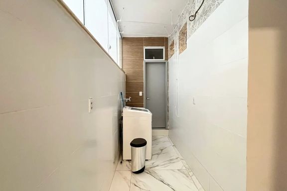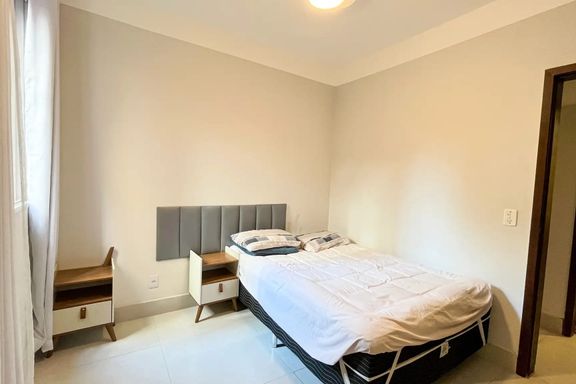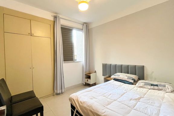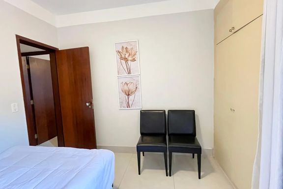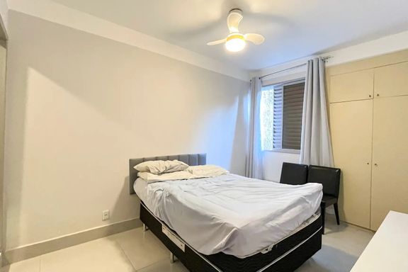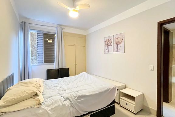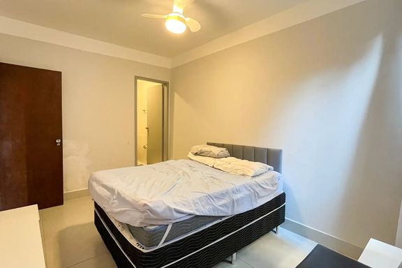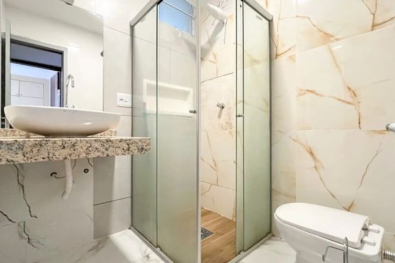 2 quartos com armários planejados e piso em porcelanato, sendo 1 suíte. Banheiros social e suíte com acabamento de qualidade, espelho e box em blindex.