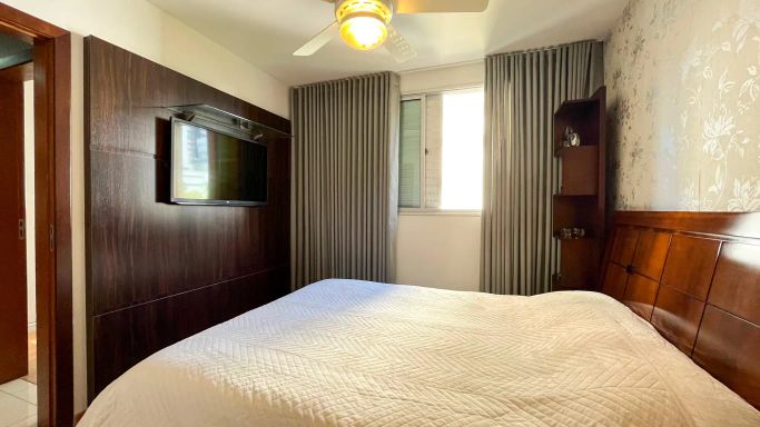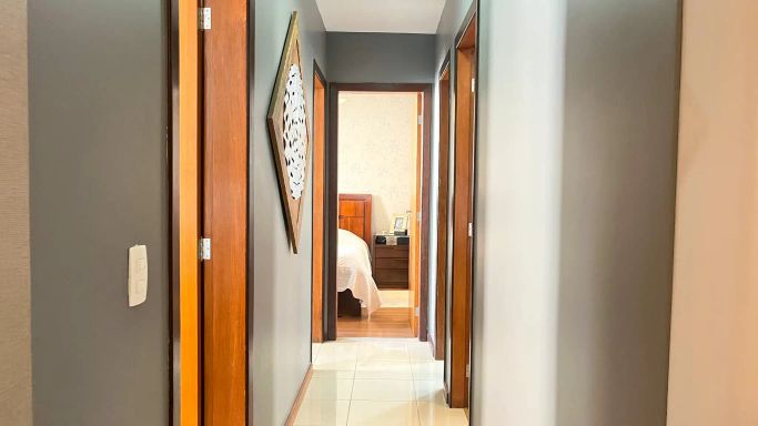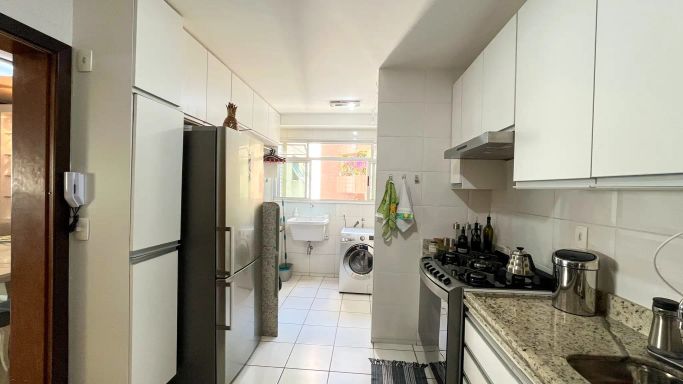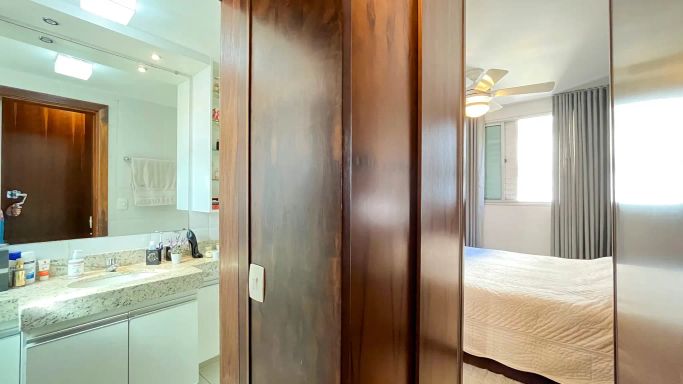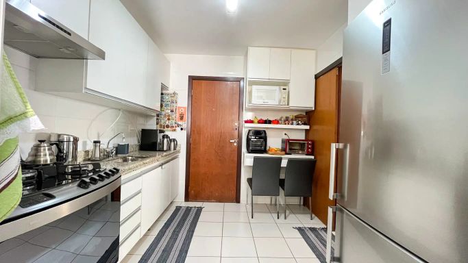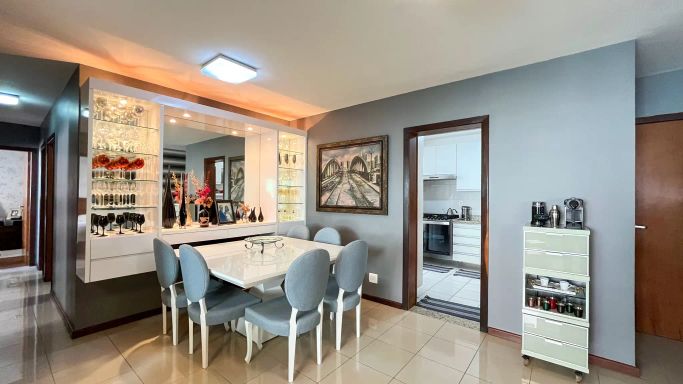Sala espaçosa para dois ambientes com iluminação planejada, rebaixamento de gesso, piso em porcelanato e varanda incorporada. 4 quartos com armários planejados e piso em laminado de madeira, sendo 1 suíte. Banheiros (social e suíte) com um excelente acabamento, armários, espelhos e box em blindex. Cozinha funcional com armários, bancada em granito, piso em cerâmica e coifa. Área de serviço independente. Infraestrutura do condomínio: Prédio 100% revestido, com 2 elevadores, sistema de alarme, câmeras de segurança, gás canalizado, interfone e portão eletrônico. Lazer completo: Salão de festas, espaço gourmet, piscina, salão de jogos e sauna. Vagas de garagem: 02 vagas cobertas e em linha + box de despejo.